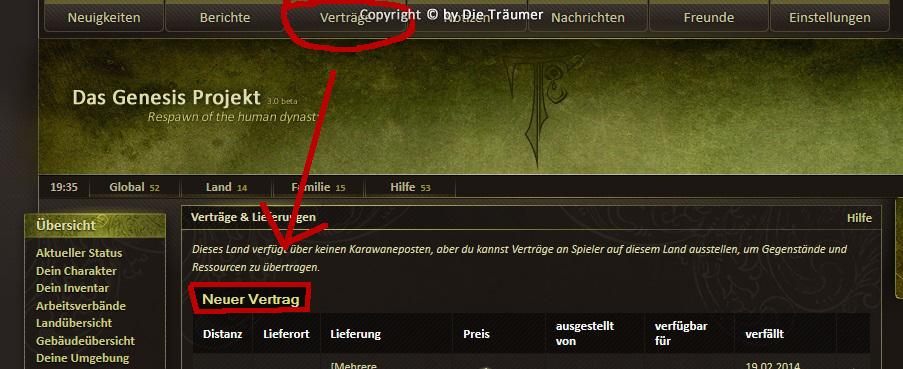Der Handel im Genesis Projekt findet über Verträge statt. Um selbst einen solchen Vertrag aufzusetzen musst du zuerst in der oberen Leiste auf den dritten Button "Verträge" klicken und danach "Neuer Vertrag" auswählen.