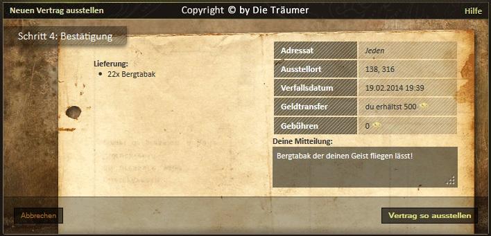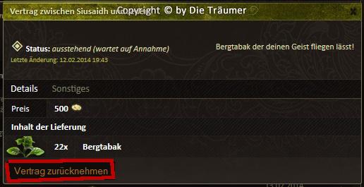 Falls dir im Nachhinein auffällt, dass du einen Fehler gemacht hast oder deinen Bergtabak am liebsten selber rauchst, musst du deinen Vertrag aus der Vertragsliste auswählen und auf den Button "Vertrag zurücknehmen" klicken. Wichtig ist aber, dass die Ware nun im VERSTECK des Landes liegt, auf dem der Vertrag ausgestellt wurde, notfalls müssen Waren also wieder manuell vom Versteck in den Rucksack geschoben werden.